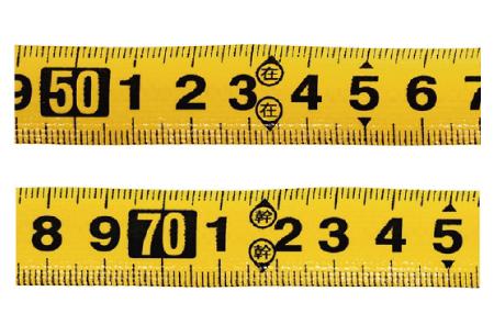 This tape measure includes special marks designed for railway track measurement work. When the mark is aligned with the inner edge of the rail, it corresponds to a measurement taken from the track center line (axle center point).